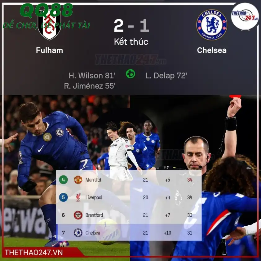 QQ88 đưa tin – (Kết quả bóng đá) – Chelsea nhận thất bại cay đắng 1-2 trên sân Fulham sau tấm thẻ đỏ tai hại, qua đó tiếp tục trượt dài khủng hoảng và tự làm khó mình trong cuộc đua top 4 Ngoại hạng Anh.